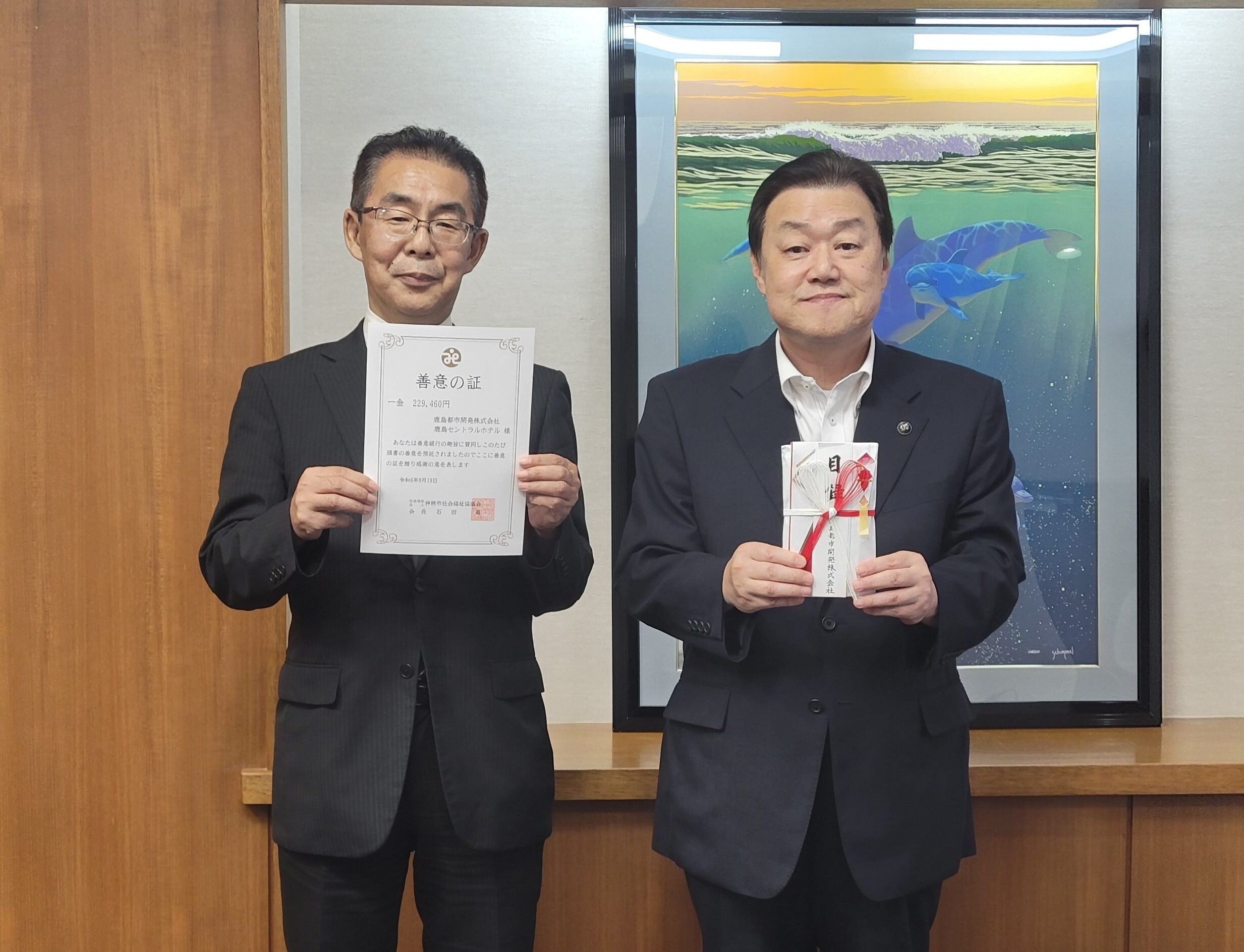 神栖市社会福祉協議会へ寄付致しました 2024.09.20 Tweet Share RSS 去る令和6年8月25日、鹿島都市開発株式会社(鹿島セントラルホテル)は「SDGs(持続可能な開発目標)活動」の取組みの一環として、鹿島セントラルホテル本館時代に使用していたブランド食器などの販売会を開催いたしました。出品数はホテル創業年である1972年を記念して、1972点をご用意し、おかげさまで完売することができました。ご来場いただき、誠にありがとうございました。このたび、販売会で得た売上につきまして、諸経費を差し引いた229,460円全額を神栖市社会福祉協議会へ寄付致しました。令和6年9月19日、神栖市役所にて、同協議会会長(石田進市長)へ目録をお渡ししてまいりました。寄付を実施するにあたり、神栖市社会福祉協議会様のご助力のもと贈呈式を無事執り行えましたこと御礼申し上げます。 Tweet Share RSS